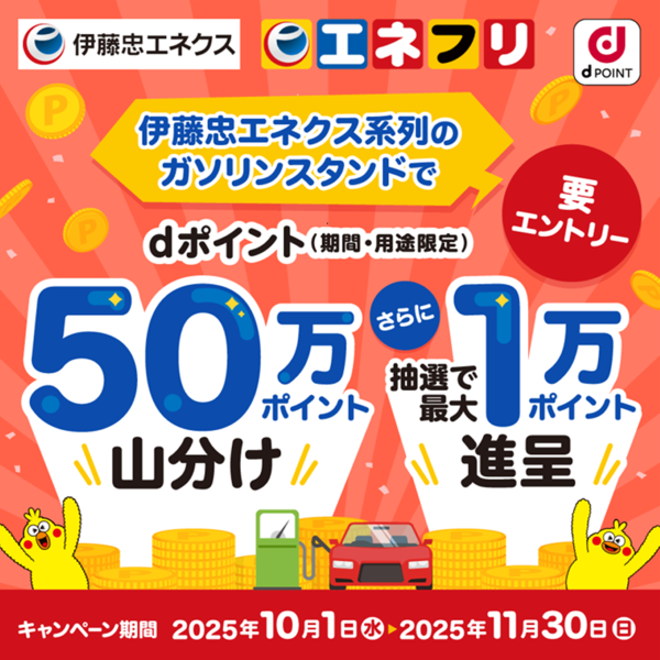 伊藤忠エネクス系列のガソリンスタンドでdポイントカードをご提示いただくと...総額50万ポイントを山分け!さらに抽選で最大1万ポイント進呈のチャンス!!!・ エントリー必須・ dポイントをためると自動的に対象ぜひこの機会にお得に給油してください!【実施期間】2025年10月1日(水)~ 11月30日(日)詳しい条件・エントリーはこちらから