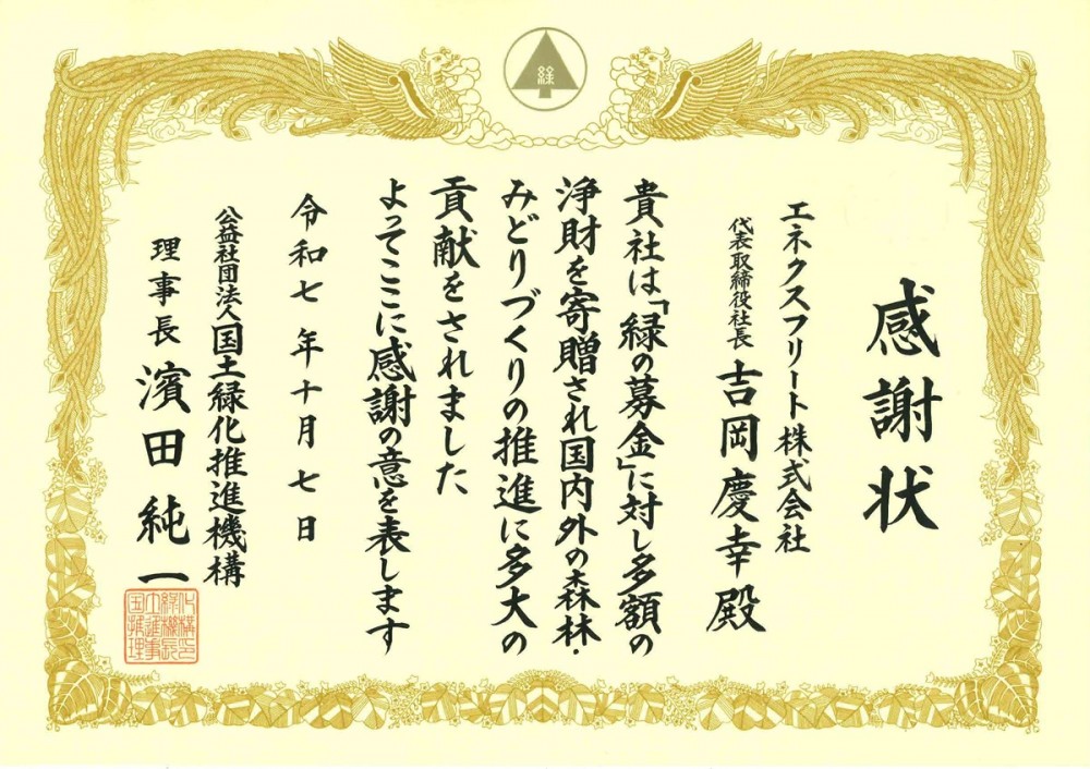 このたび、トラック祭を通じて実施した「緑の募金」への寄付に対し、公益社団法人 国土緑化推進機構( https://www.green.or.jp/ )より感謝状をいただきました。