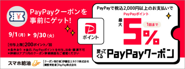 【9/1から】PayPay 最大5%戻ってくるクーポンを配布!
