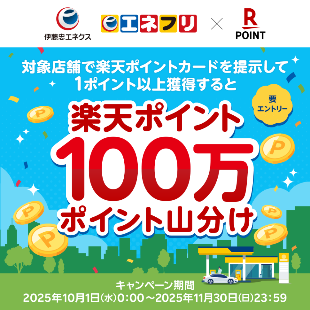 キャンペーン期間中、楽天ポイントカードをご提示のうえお会計いただくと、総額100万ポイント!!を山分けでプレゼント!・ 特典ポイントの上限は100ポイント・ 事前にエントリーが必要ですこの機会にぜひお得にご利用ください!【実施期間】2025年10月1日(水)0:00 ~ 11月30日(日)23:59詳しい条件・エントリーはこちらから
