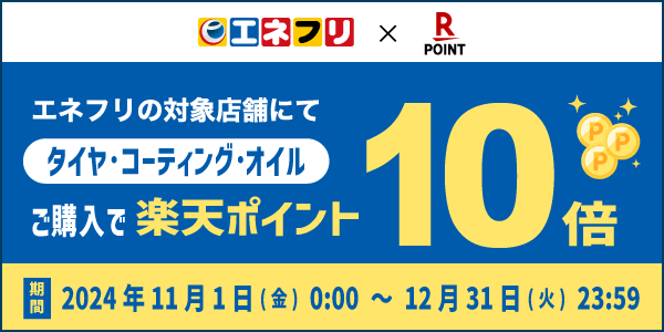 2024年11月1日~12月31日の2か月間、エネフリの対象店舗で楽天ポイントカードを提示して、タイヤ・コーティング・オイルのいずれかをご購入された楽天会員さまには楽天ポイントが通常の10倍付与されます。