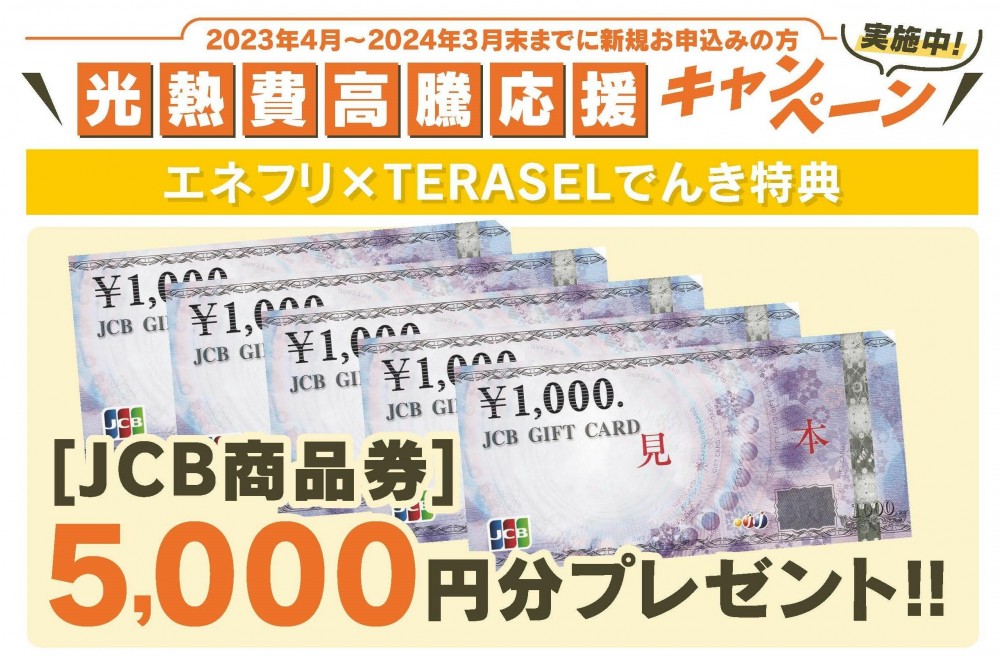 エネフリでは、光熱費高騰応援キャンペーンとして、2024年3月末までにTERASELでんきを新規お申し込みいただいた方全員に、JCB商品券5,000円のプレゼントキャンペーンを実施しています。